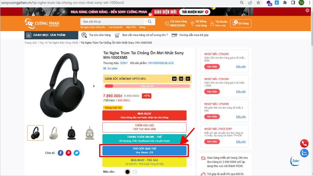 Sau khi lựa chọn được sản phẩm ưng ý trên website sonycuongphan.vn, khách hàng tiến hành chọn hình thức thanh toán TRẢ GÓP QUA THẺ (Visa/Master/JCB).