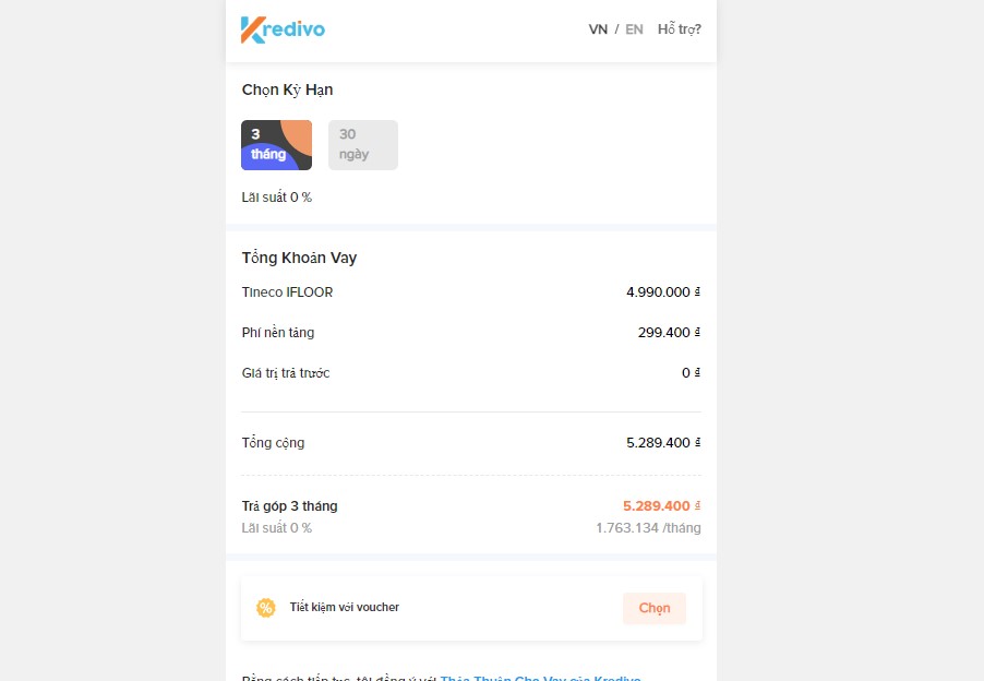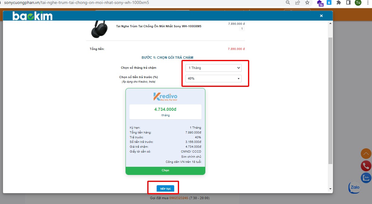Lựa chọn kỳ hạn trả chậm và phần trăm % trả trước. Sau đó, bấm TIẾP TỤC.