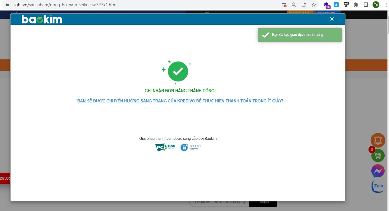 Sau khi xác nhận đơn, khách hàng vui lòng chờ giây lát chuyển hướng đến trang Kredivo.