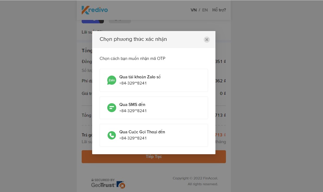 Khách hàng chọn cách nhận OTP để xác thực thanh toán.
