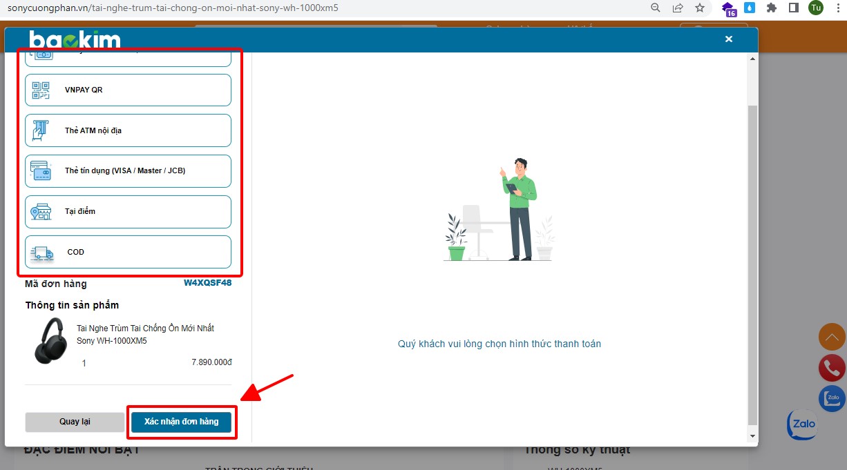Lựa chọn hình thức thanh toán khoản trả trước, sau đó Xác nhận đơn hàng và làm theo các yêu cầu của hệ thống.