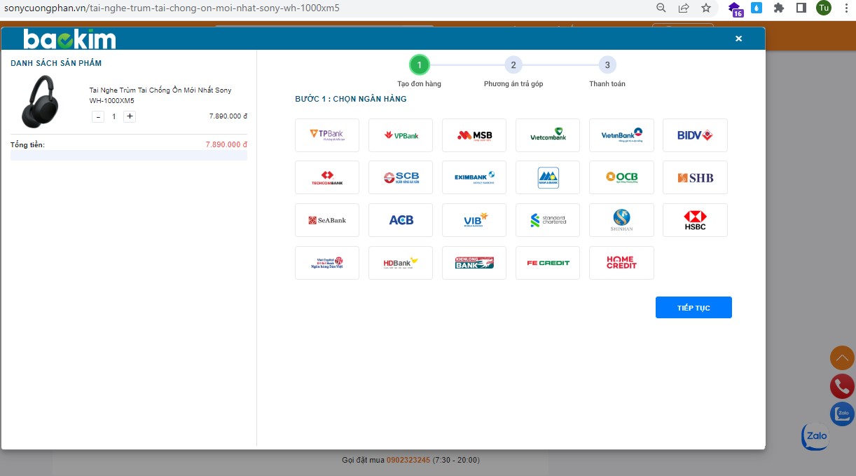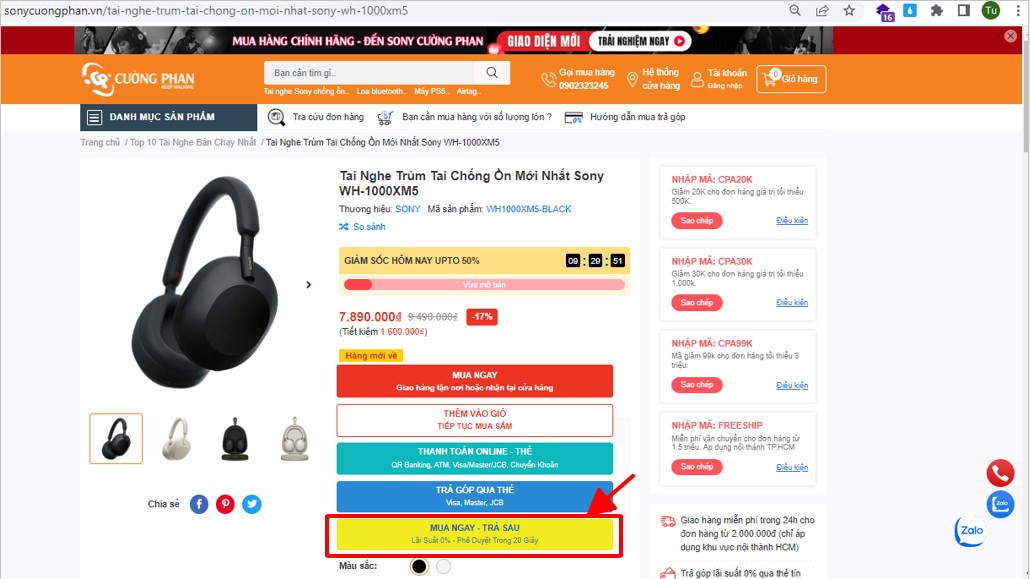Sau khi lựa chọn được sản phẩm ưng ý trên website Sonycuongphan.vn, khách hàng tiến hành chọn hình thức thanh toán MUA NGAY – TRẢ SAU (Lãi suất 0% - Phê duyệt trong 30 giây).