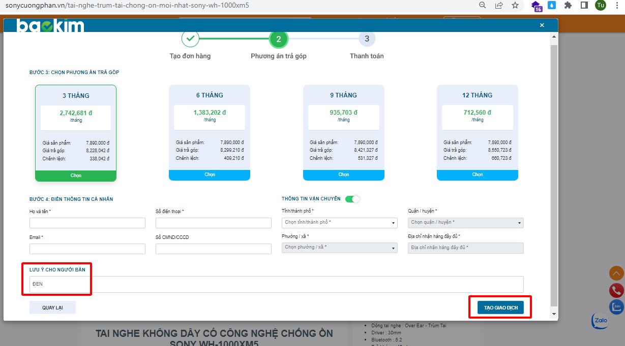 Chọn gói thanh toán trả góp (3, 6, 9, 12 tháng), điền đầy đủ thông tin khách hàng và TẠO GIAO DỊCH.