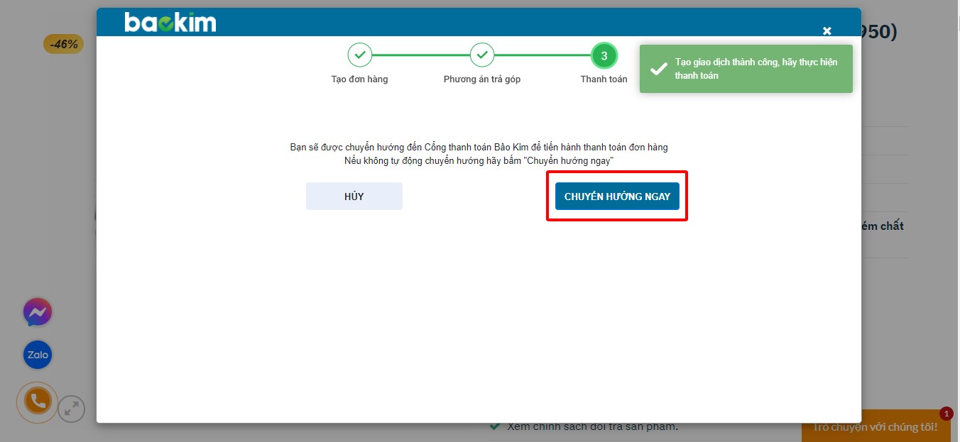 Bấm Chuyển hướng ngay đến phần thanh toán.