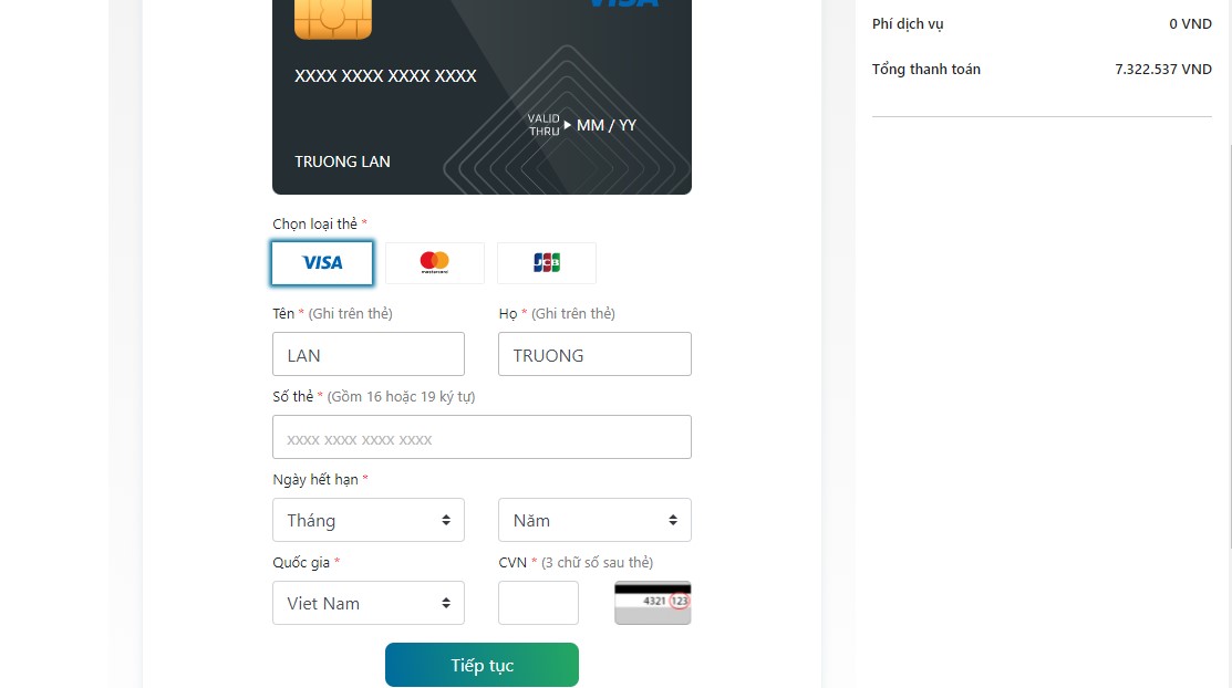 Chọn loại thẻ tín dụng và điền thông tin trên thẻ để thanh toán.