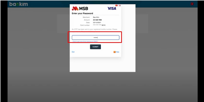Nhập OTP được gửi qua số điện thoại đã nhập và nhấn Submit để xác nhận thanh toán.