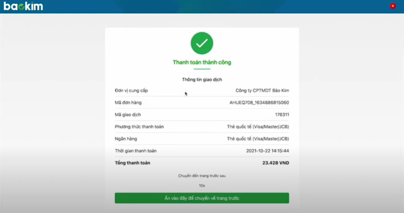 Sau khi hoàn tất đơn hàng sẽ có thông báo THANH TOÁN THÀNH CÔNG.