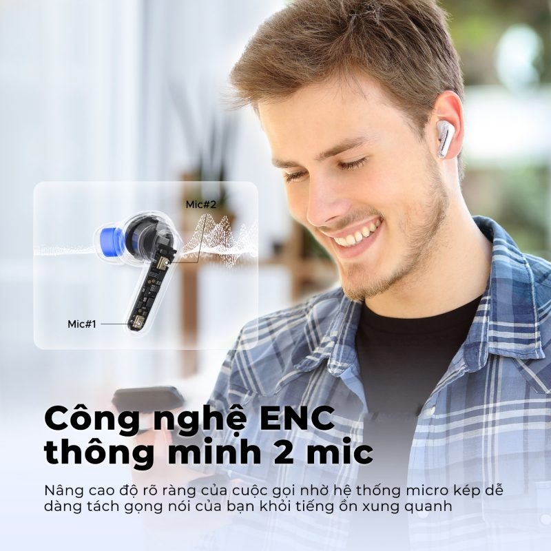 Tai nghe Bluetooth SoundPEATS Clear được trang bị 2 mic kép với công nghệ ENC chống ồn môi trường.Công nghệ này hỗ trợ cho quá trình đàm thoại được rõ ràng và chi tiết hơn.Tiếng ồn và tạp âm khi trò chuyện ở nơi đông người sẽ được lọc ở mức tối đa. Giọng nói của bạn được tái tạo chi tiết và trong trẻo trước khi được truyền tải đến đầu dây bên kia. Cuộc gọi của bạn luôn trong trạng thái rõ ràng dù ở bất kỳ môi trường nào.