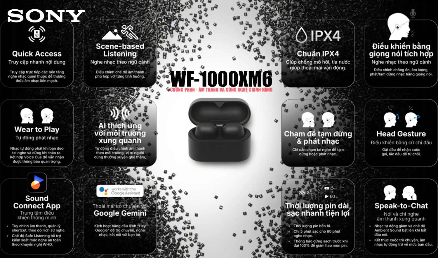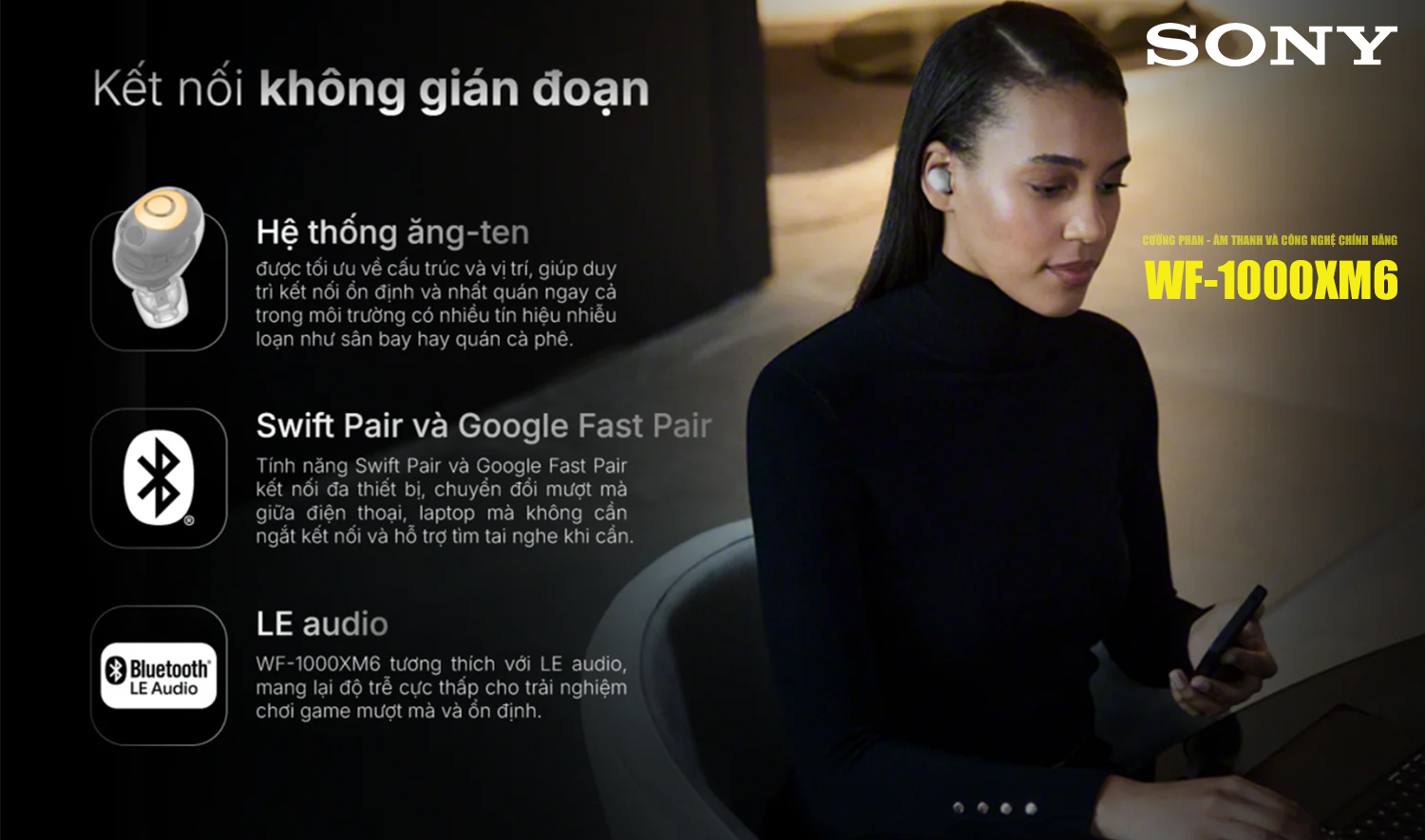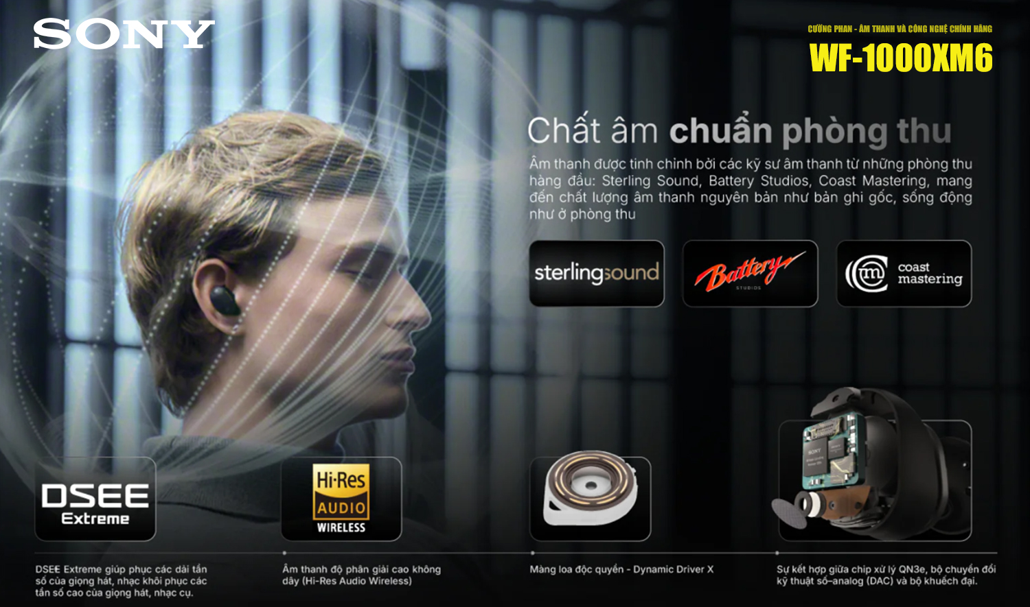 - WF-1000XM6 sử dụng bộ xử lý 32-bit (so với 24-bit trên XM5) và hỗ trợ ANC thích ứng theo thời gian thực (Adaptive NC Optimiser).